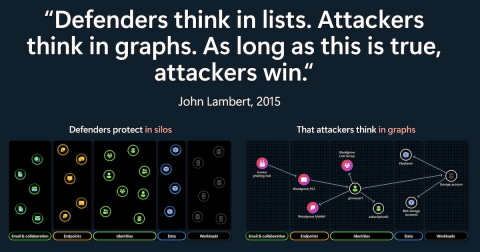 防御者は各セキュリティ領域を個別に管理し、サイロごとに対策を考えるのに対し、攻撃者は組織全体を相互接続されたネットワークとして捉えて脆弱な場所を見つけ、攻撃チェーンを構築する「グラフ思考」で行動するためだ( 図1 )。