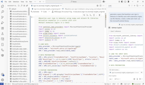 GitHub Copilotと連携しているため、Pythonなどプログラミング言語の専門知識がなくても、自然言語で「異常なログイン行動を検出するクエリを生成して」と依頼するだけで、機械学習を活用した分析コードが自動生成される( 図4 )。この統合により、数行のプロンプトから深い分析コードを生成し、インシデント対応、フォレンジック分析、脅威インテリジェンスマッチング、異常検出と、高度な分析を実行できるようになる。
