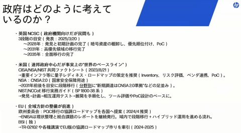「米国ではCISAなどの機関が共同で、重要インフラの次世代ロードマップを示し、2030年までの移行を推奨するファクトシートを発表しています。英国でも2031年までの優先領域への移行、2035年までの全面移行のスケジュールを公表しています」(木下氏)