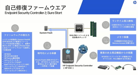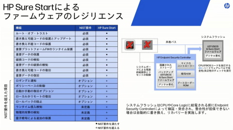 PCの起動前にBIOSへの攻撃や不正な改ざんを検知し、自動的に復旧するハードウェアレベルの防御機能「HP Sure Start」もESCの機能の1つだ (図4) 。HP Sure StartにはNIST(米国国立標準技術研究所)が求める機能のすべてが網羅的に用意されているという。