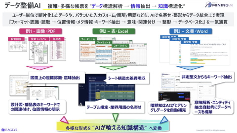EAGLYSでは、企業のAIエージェントの活用支援を狙いに、AIナレッジベースの開発基盤「EAGLYS MINING AI」やデータ管理機能をワンストップで実現する「EAGLYS ALCHEMISTA Labs」など、AIナレッジベースとデータ整備AIの実現に活用を見込めるツールを広範に提供する。