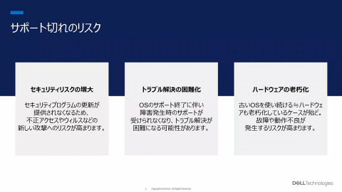「まず、セキュリティプログラムの更新が提供されなくなるため、不正アクセスやウイルスなどの新しい攻撃へのリスクが高まる。また、OSのサポート終了にともない、障害発生時のサポートが受けられなくなり、トラブル解決が困難になる可能性がある。さらに、サーバーのハードウェアも老朽化しているケースがほとんどで、故障や動作不良が発生する恐れもある」と警鐘を鳴らす。