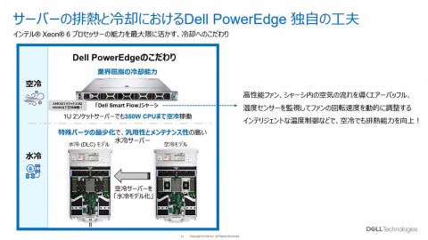 そして、導入を検討するべきサーバーの最新トレンドについて、「プロセッサーの発熱量上昇にともない、水冷サーバーのニーズが急速に拡大している。今年は『水冷元年』ともいわれるが、その一方で、水冷サーバーは水を循環させる仕組みが必要であり、初期投資の負担が大きいため、空冷サーバーを選択する企業が多いのも実情。こうした中、当社の『Dell PowerEdgeサーバー』では、高性能ファンやエアーバッフル、インテリジェントな温度制御など独自の工夫によって、空冷サーバーの排熱能力を大幅に向上させ、できる限り空冷で対応できるようにしている( 図3 )。また、水冷サーバーについては、特殊パーツの最少化で、空冷サーバーを“水冷モデル化”し、汎用性とメンテナンス性を高めている」と解説した。