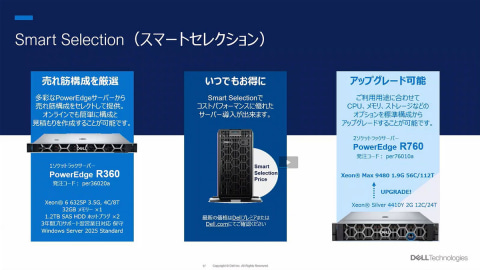 これに対して大林氏は、「Smart Selectionは、Dellプレミア、Dell.comなどのオンラインや営業からの見積もりなどで確認できる。また、販売代理店やディストリビューター経由での購入にも対応している。カスタマイズについては、初期構成から、メモリ容量やHDD/SSD台数・大容量化、NIC増設、CPU種別の選択、電源・冗長化、保守・サービス内容変更など、用途に合わせたオプションの選択が可能となっている」と回答してくれた。