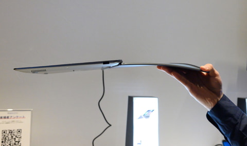 その驚異的な強度は、イベントでのデモンストレーションでも披露された。まず液晶パネルとヒンジの耐久テストでは、従来のPCなら破損しかねない強い力で画面の端を持ってねじ曲げても、全く壊れないしなやかさが示された。