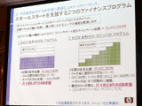 コストパフォーマンスとしては、GB単価199.9円の低価格を実現した。製品の最小構成価格は、ExDS9100ベースラック、c7000、BL460c×4基、82TBのキャパシティブロック×3台、Red Hat Enterprise Linux 4、各種管理ツール込みで4917万円(税別)。合計容量は246TBなので、計算すると1GBあたり199.9円となる。ただしこの価格は2009年3月末までのキャンペーン価格で、「その後、市場のニーズを見ながら、上がるかもしれないし、逆に下がるかもしれない」(高橋氏)とのこと。ただ、GB単価が何十円、何百円と上がることはないとしている。