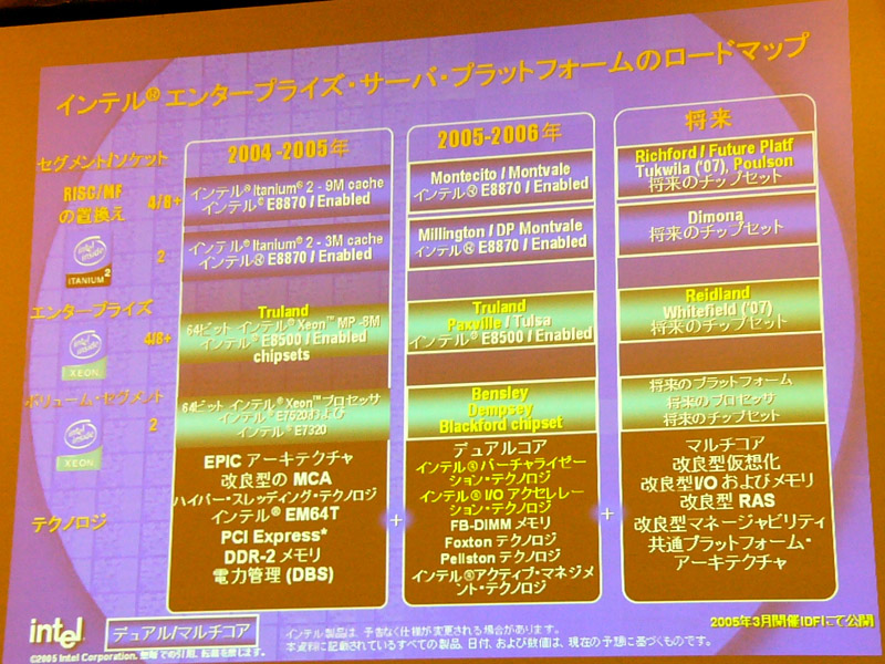 エンタープライズサーバープラットフォームのロードマップ。IDFではXeon MP・Xeon DP関連のプラットフォームが新たに発表された