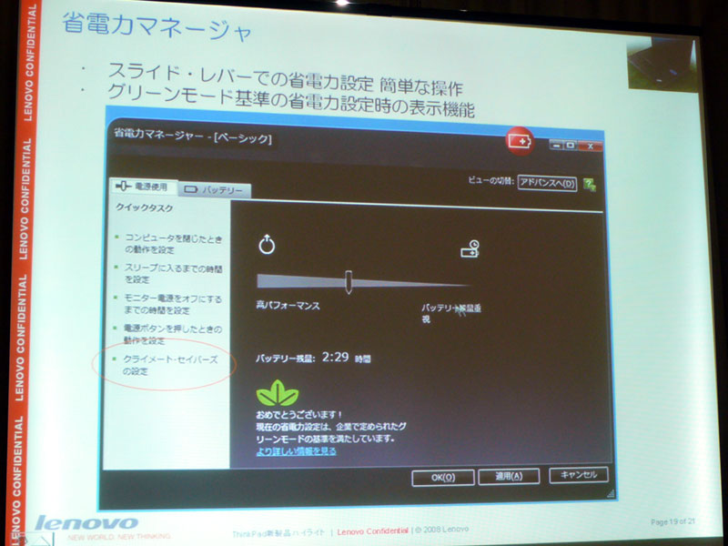 省電力重視の設定にしていくと、グリーンIT推進団体の基準を満たしたことが、アイコンで示される
