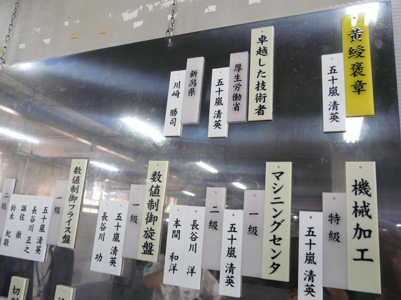 まさに匠がいることを示す銘板。社内に認定技術者を張り出している。匠としての黄綬褒章受章者もいる