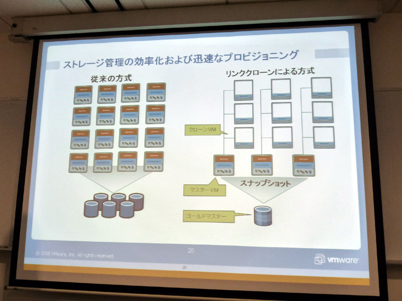 差分情報を持つクローンVMが中心となるため、従来方式と比べて容量面でも管理面でも優位に