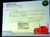 接続性の向上は、今回のバージョンアップにおける最大の機能強化ポイント。SSL-VPNの一体化、シングル・サインオン、Vasco 二要素認証のサポート、VoIPおよびビデオ会議のサポートといった多くの新機能を追加している。SSL-VPNの一体化では、遠隔ユーザーからのアクセスをサポートするVPN機能を強化し、1つの筐体で支店間やモバイルユーザーによるSSL-VPNの利用を実現した。また、社内からのLANを使ったアクセスでも、社外からVPNへのアクセスでも、シングルサインオンを可能にするため、パススルー認証をサポート。認証時には、Vascoの二要素認証を行い、ネットワークを保護する。VoIPおよびビデオ会議のサポートについては、新しいH.323やSIPプロキシにより、LANとインターネットの間のビデオやオーディオトラフィックを処理する。さらに、無線LANを利用するユーザー向けに、ワイヤレスブリッジモードを搭載している。