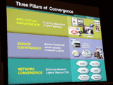 これらに対するボルピ氏が出したキーワードが「コンバージェンス」つまり、収束・統合だ。ボルピ氏は今後のテーマとして(1)ATMやフレームリレーといった非IPの通信方式を「IP/MPLS(Multi Protocol Label Switching)」に統合する「ネットワークの収束」、(2)複数のサービスに連携や継続性を持たせる「サービスの収束」、(3)複数のアプリケーションやサービスを統合し新たな価値を持たせる「アプリケーションの収束」が重要とした。