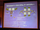 2008年に発表予定の次期マイクロアーキテクチャNehalemに関しては、システムアーキテクチャなどを紹介。Nehalemで採用されるシリアルインターフェイスQuickPath Interconnectでは、これまでのプロセッサとチップセットとの接続だけでなく、プロセッサ間での直接接続にも使われることや、メモリコントローラの内蔵、オプションでのグラフィックス機能内蔵などが明らかにされた。
